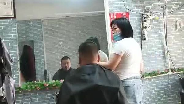 理發店五十多半老徐娘,下體夾著跳蛋給顧客剪頭發,勾引男的去後面啪啪,老B敗火